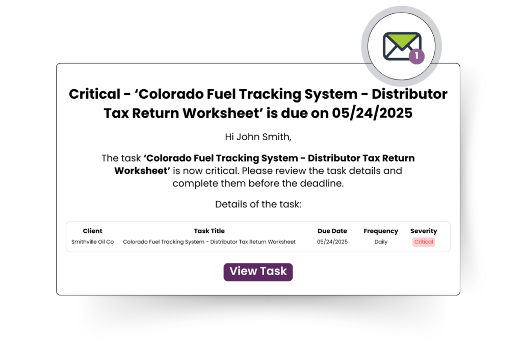 - No reminders or built-in fail-safes: Fuel excise tax deadlines vary on a state and county level and are subject to holiday adjustments. Spreadsheets don’t send alerts, escalate risks, or auto-adjust for weekends and state holidays, making missed deadlines much more likely. This is extra true in the age of the silver tsunami with key personnel retiring and critical processes being transferred with insufficient knowledge transfer.