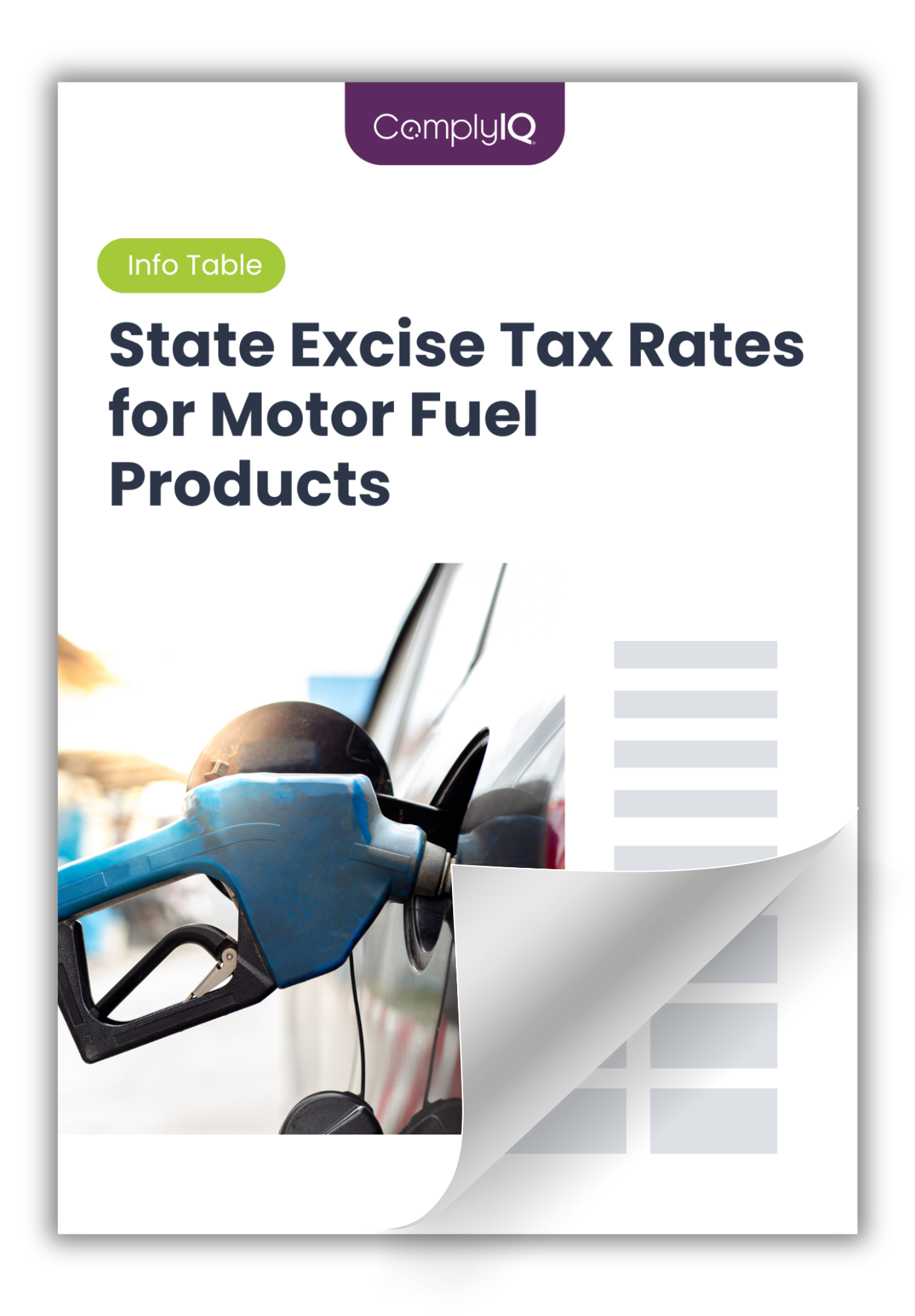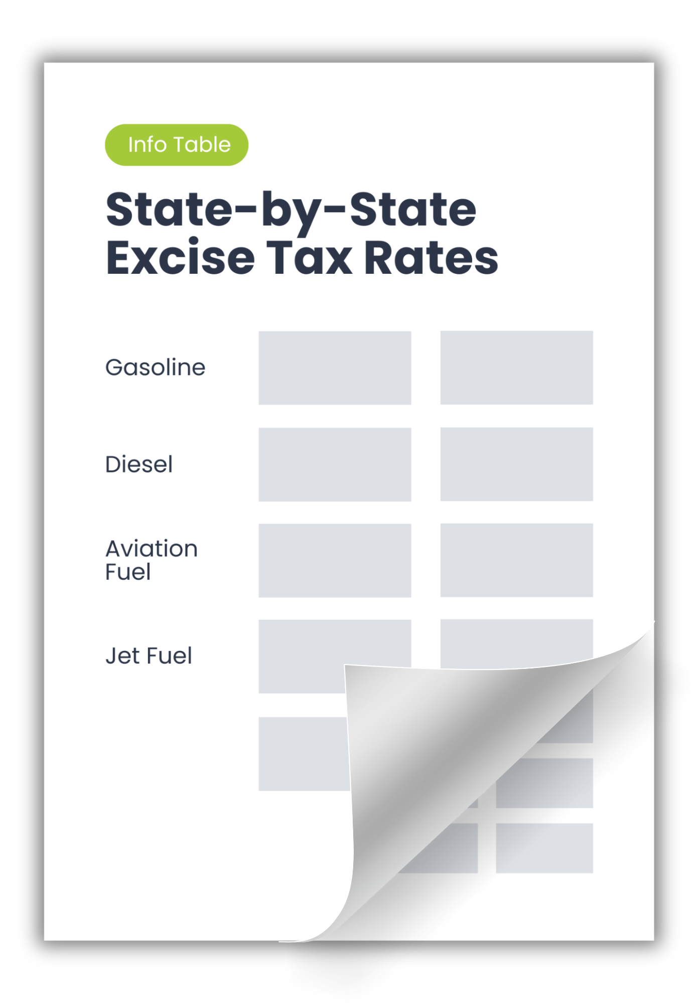 Access the info table to see state excise rates for gasoline, diesel, aviation fuel, and jet fuel across all states.